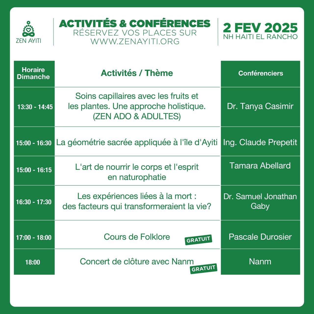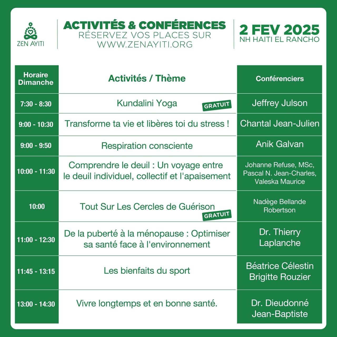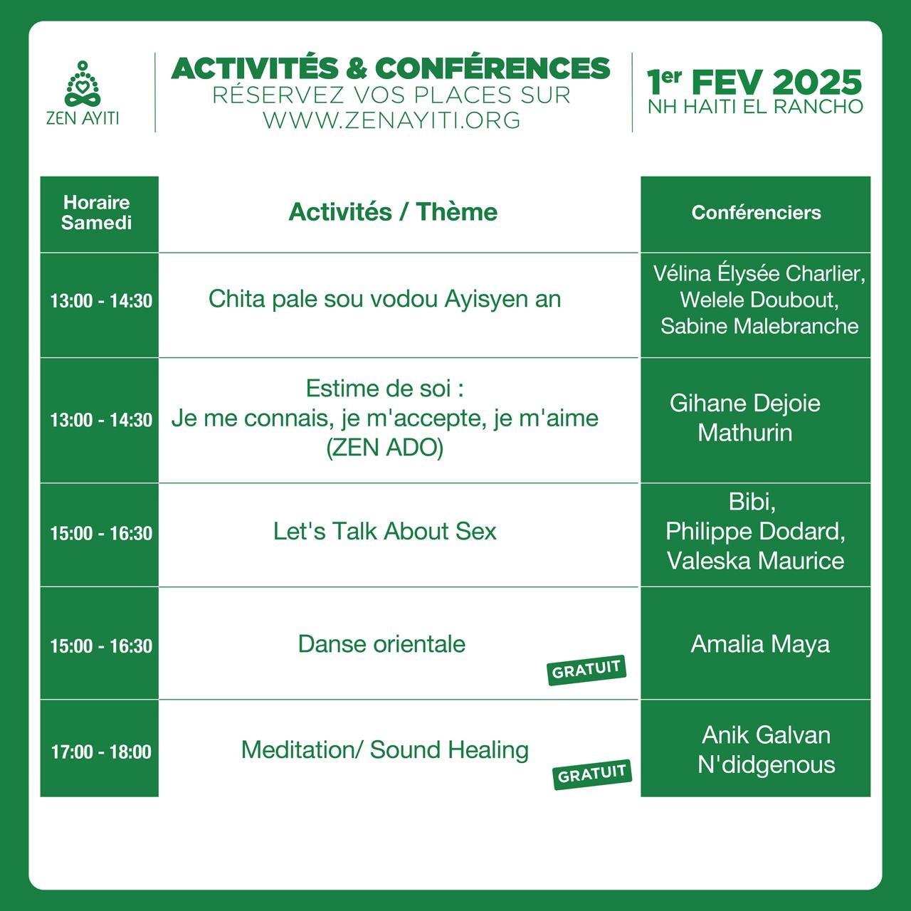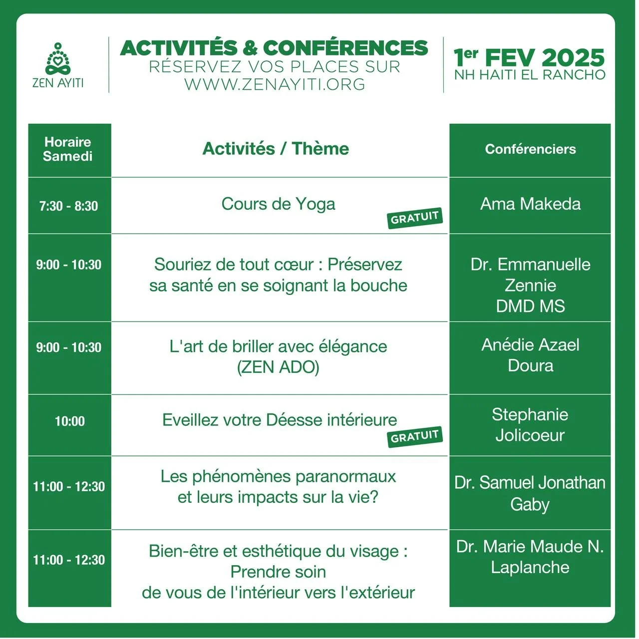 Horaire des activités et conférences de la deuxième journée de la Rencontre du Bien-être et de la Spiritualité.